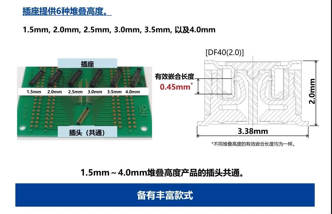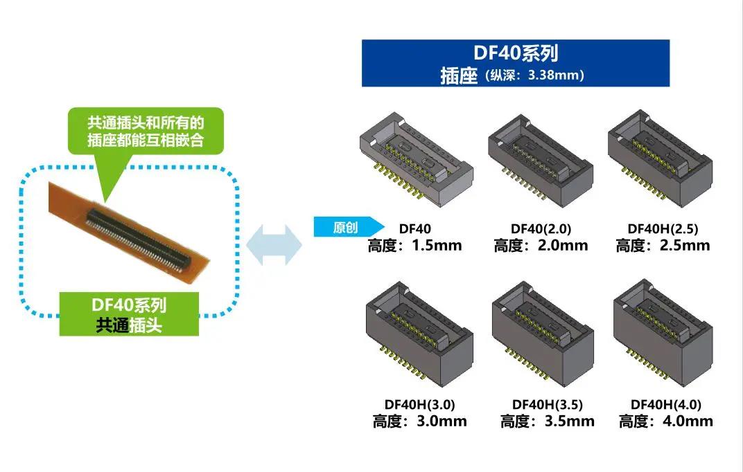 特点 1. 省空间:纵深3.38mm 2. 堆叠高度 1.5-4.0mm 3. 对应USB4 Gen.2(10Gbps)信号传输 *1 4. 有效嵌合长度长:0.45mm 5. 卓越的端子构造实现了明确的锁扣手感以及大嵌合力 6. 防止端子变形构造 7. 种类繁多(带护罩:DF40G系列,带完全锁:DF40GL系列,ADAS:DF40T系列) 8.核心数量从10到120核心变化巨大 9.用导向肋确保自动对准:0.33mm 10.防止镍阻挡层焊接的结构 11.还提供用于生产线检查的高度耐用的永利3044集团官网* 只有H=1.5 mm的产品支持Type-C DF40系列变体