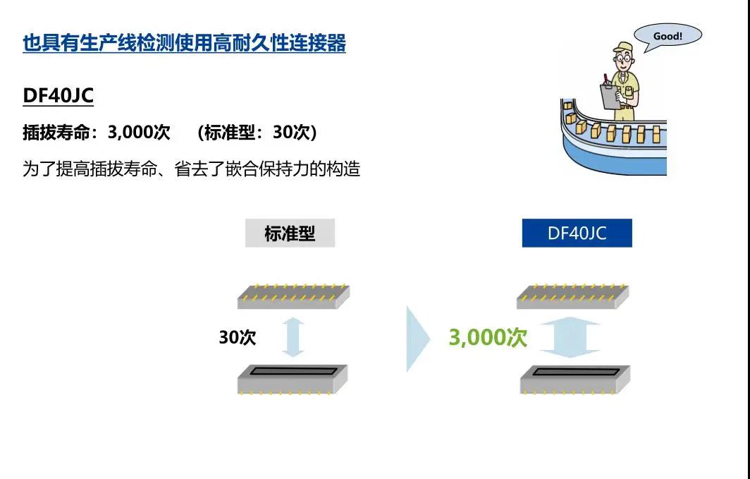 7. 种类繁多(带护罩:DF40G系列,带完全锁:DF40GL系列,ADAS:DF40T系列) 8.核心数量从10到120核心变化巨大 9.用导向肋确保自动对准:0.33mm 10.防止镍阻挡层焊接的结构 11.还提供用于生产线检查的高度耐用的永利3044集团官网* 只有H=1.5 mm的产品支持Type-C